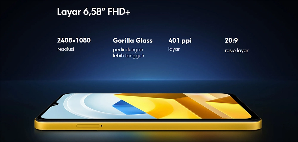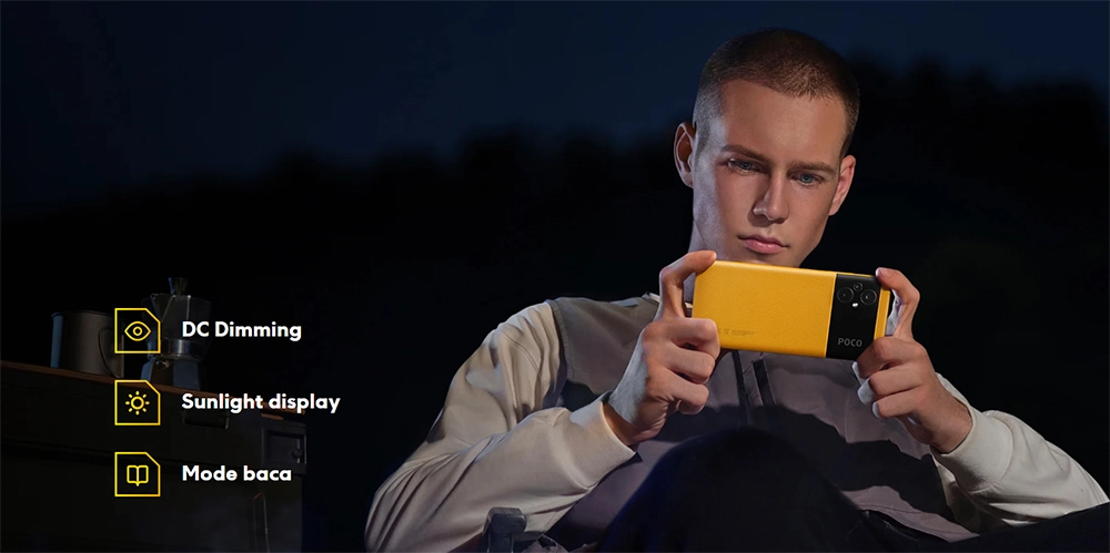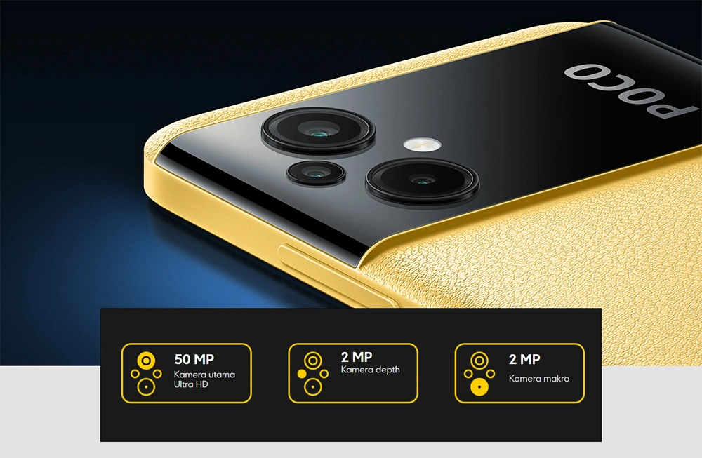 Desain premium Tekstur seperti kulit, anti sidik jari Desain bagian pinggir yang rata dan menyatu membuatnya nyaman dipegang. Teksturnya yang halus seperti kulit juga antinoda. Casing belakangnya yang terbuat dari dua kombinasi bahan menciptakan kontras yang tajam, sehingga membuat POCO M5 ini tampak menawan.