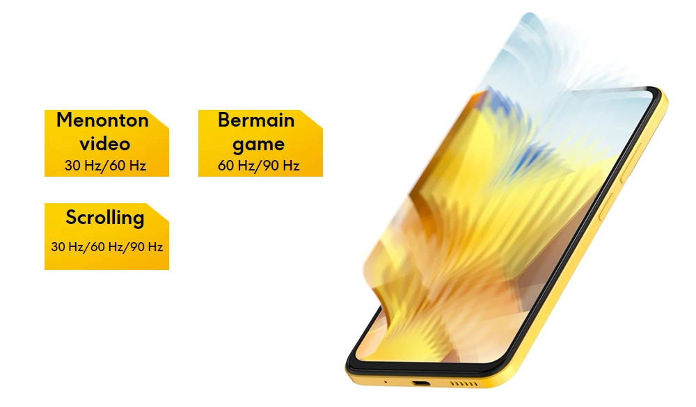Tipe Layar : FHD+ DotDrop, IPS LCD, 90Hz, 500 nits (HBM)
