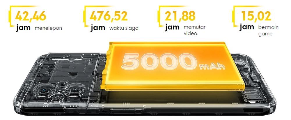 Baterai 5000 mAh (typ) + pengisian daya cepat 18W Kapasitas baterai yang besar dan pengisian daya berkecepatan tinggi menghasilkan output daya yang stabil untuk performa yang lebih maksimal.