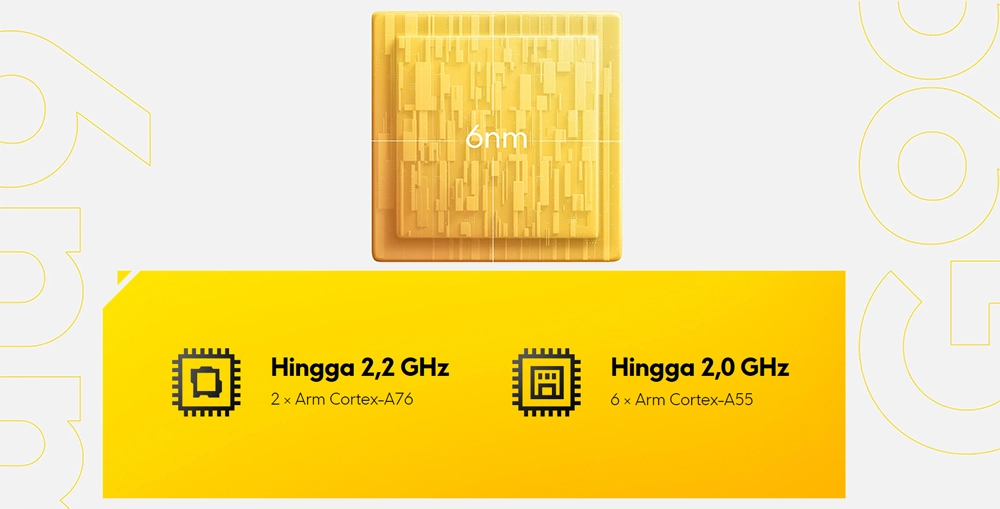 Proses octa-core 6nm unggul & tangguh Dirancang dengan teknologi proses 6nm, prosesor octa-core MediaTek Helio G99 memiliki arsitektur CPU terdepan di industri dan GPU MC2 Mali-G57 tangguh yang mampu menghasilkan performa hebat untuk pengalaman pengguna yang mengesankan.